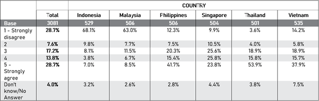 Fig. 1: Southeast Asian youth attitudes to LGBT rights. Respondents were asked to quanitfy their attitude towards the statement “Lesbian, gay, bisexual, and transgender (LGBT) rights should be protected by the state.” (Source: ISEAS-Yusof Ishak Institute, Youth and Civic Engagement in Southeast Asia Survey, 2024)