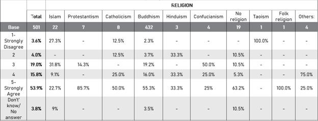 Fig. 2: Thai youth support of LGBT rights, by religion. (Source: ISEAS – Yusof Ishak Institute, Youth and Civic Engagement in Southeast Asia Survey, 2024)