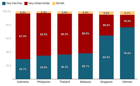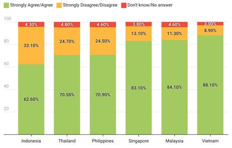 Furthermore, only 62.6 percent of Indonesian respondents “agreed” or “strongly agreed” that the country’s economic outlook over the next five years is promising, significantly lower than other Southeast Asian countries like Vietnam (88.1 percent) or Malaysia (84.1 percent) [Fig. 3].