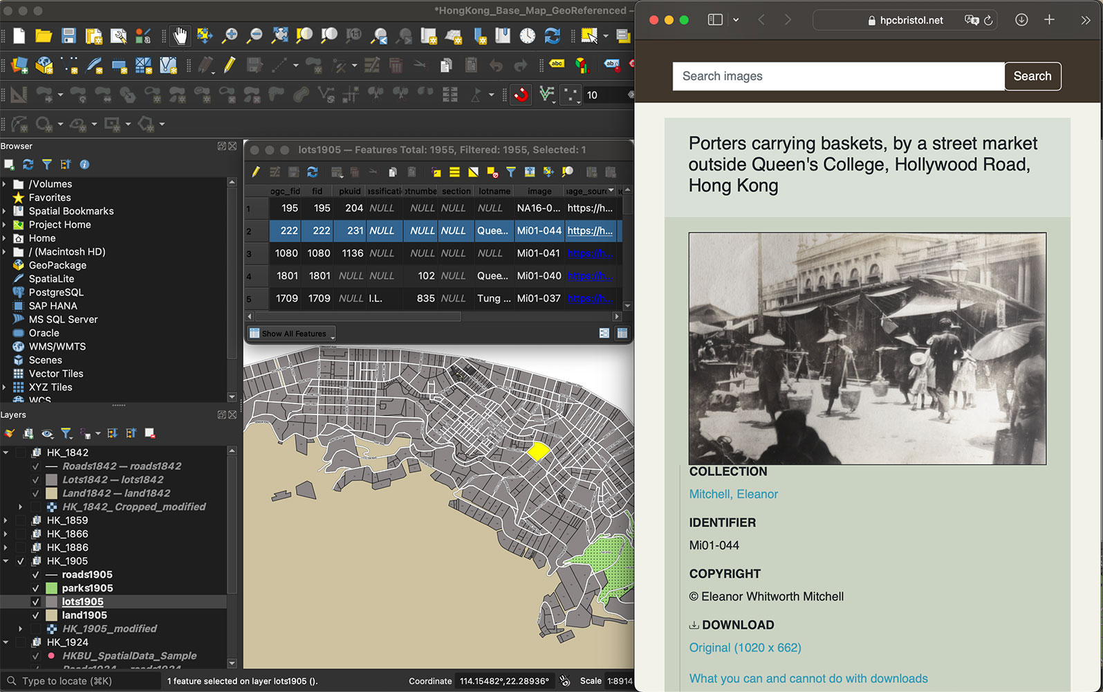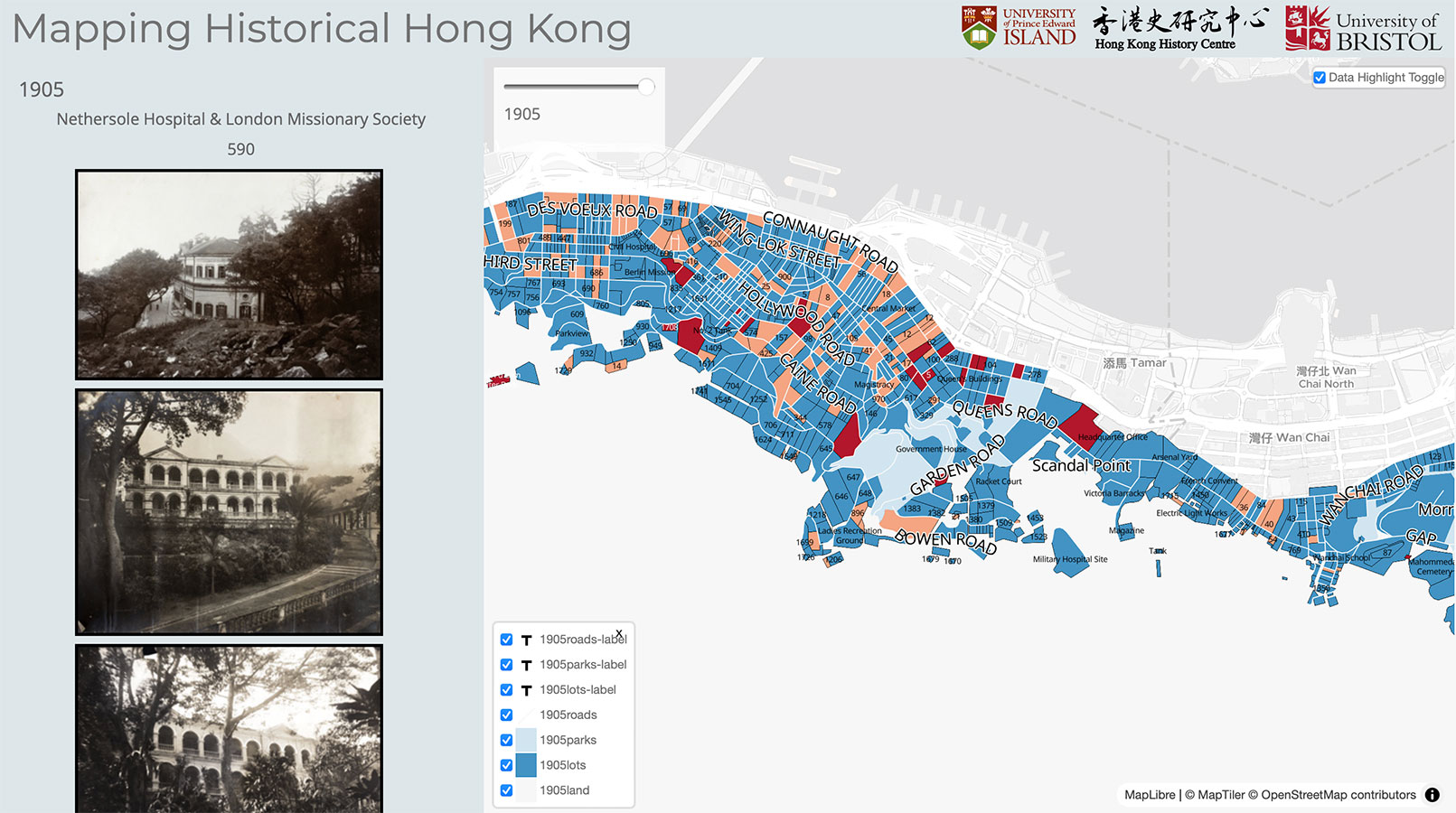 Digital tools are also well positioned to meet the challenges facing the future of Hong Kong studies. The shifting political climate and perennial concerns over archival access and preservation have embedded urban heritage projects, especially, with renewed importance. The Mapping Historical Hong Kong project (MHHK) was developed with such challenges in mind to explore the applications of digital tools for spatial and urban history and to support the global growth of Hong Kong studies and history initiatives [Fig. 1]. Aligned with the Hong Kong-based Spatial History Project, MHHK uses GIS to visualise Hong Kong’s urban growth between 1841 and 1997. The project collates and spatially organises historical data and archival resources to provide researchers and the public with a streamlined resource for exploring Hong Kong’s history [Fig. 2]. Both a tool for analysis and a finding aid for a globally diffuse range of archival materials, MHHK represents the collaborative and integrative future of Hong Kong studies.