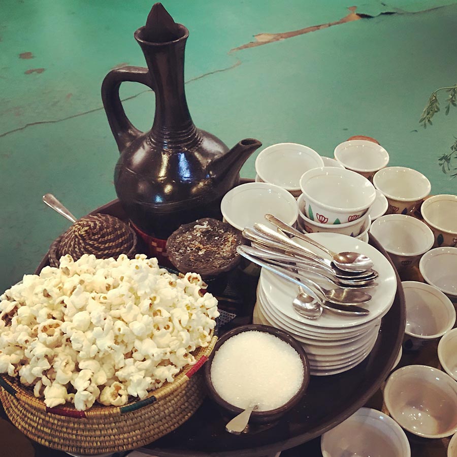 Fig. 2: An Ethiopian coffee ceremony setting with jebena, small cups, incense, popcorn, and sugar—a slow ritual of gathering, storytelling, and shared time.